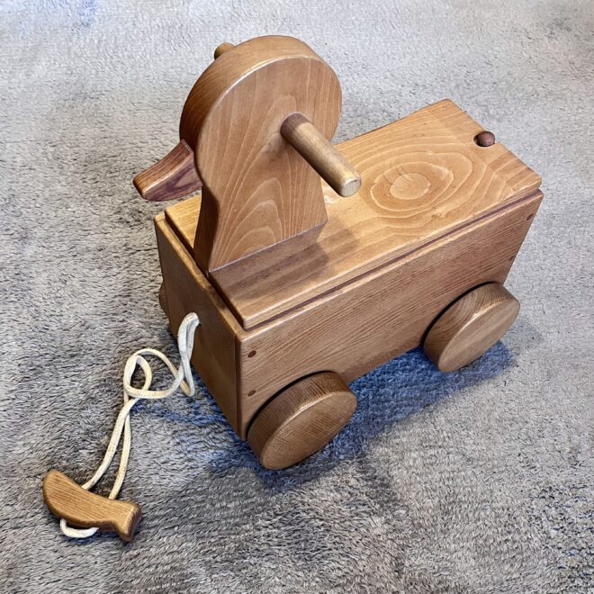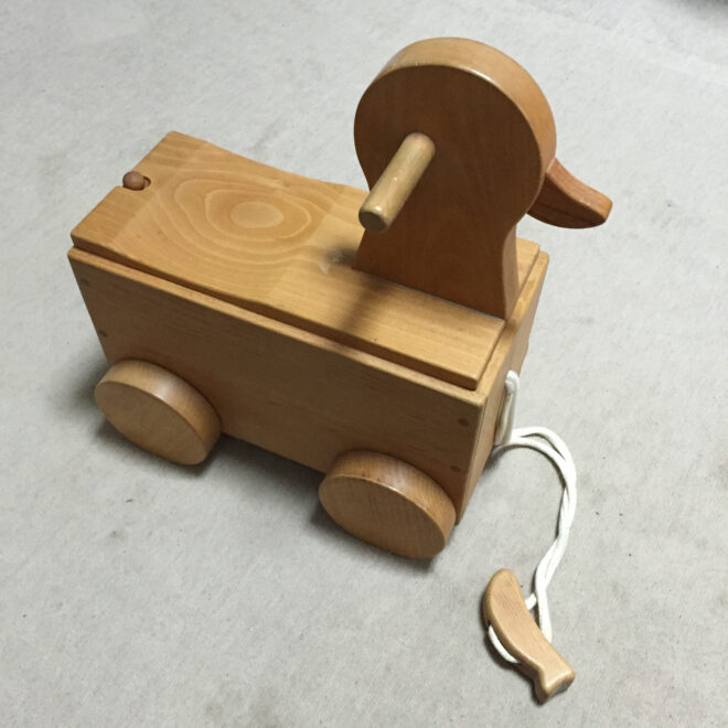 さて、このコロボックスですが、このように、手で押したり、中の積み木で遊んだし、乗ったりして遊べます。ひもの’とって’はアヒルの好きな魚の形になっています。