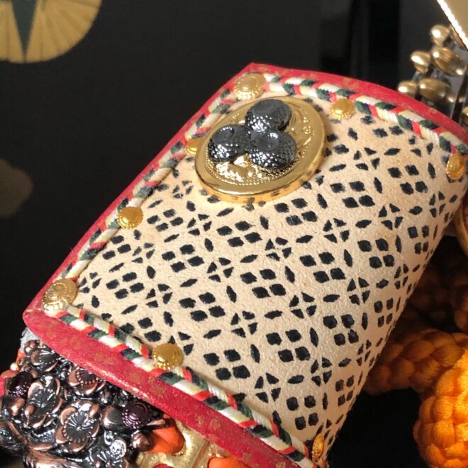 こちらも鹿なのか忘れましたが、天然の皮で、実際の甲冑と同じ素材、同じ編み方で大きさだけが小さくしてるそうです。