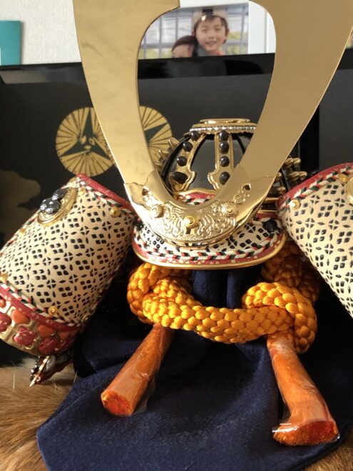 こちらは、23年前、義父母にお祝いにいただいた、兜です。知人の紹介で、千葉県印西市にある、藤沢人形工房まで行き、購入していただきました。