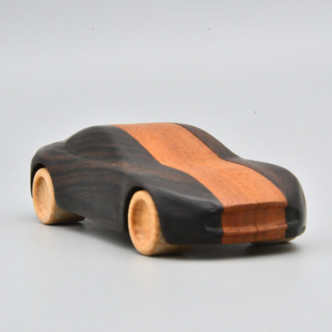 北原さんのアストンマーチンがとてもかっこよく、これ、作れないかなと試作したものが、このアストンマーチンのフォルムを参考にした木のくるまです。