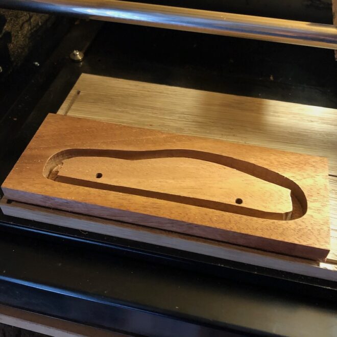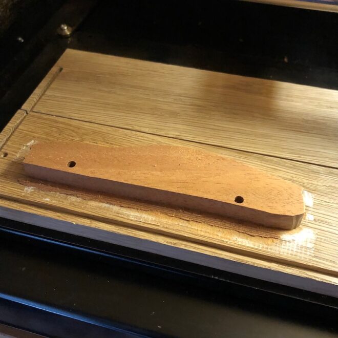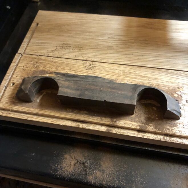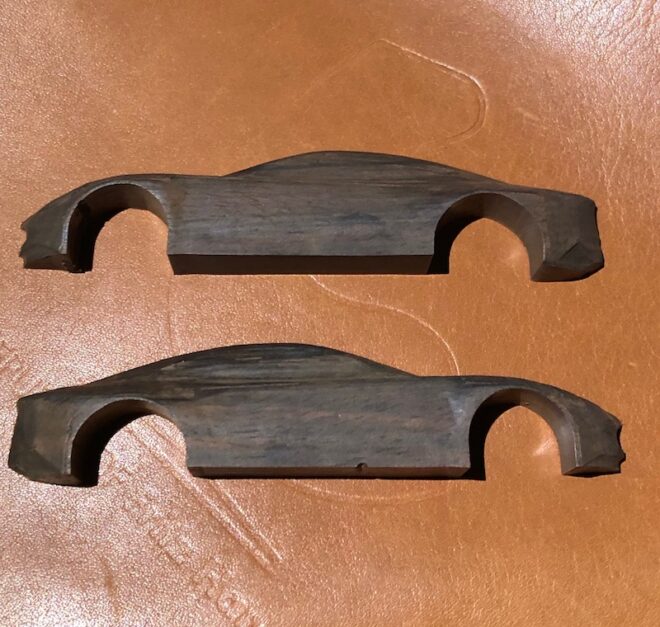 こちらのくるまは、両サイドに黒檀、真中にマホガニーの板を2枚入れ、それらを接着してボディーをつくっています。