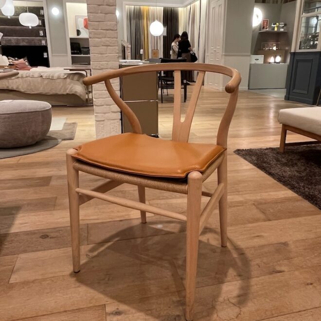 このY字の形は、一本の木材を丁寧に曲げて成形されたもので、職人たちの高い技術とウェグナーの素材に対する深い理解が詰まっています。この背もたれ部分の曲線が、椅子全体に軽やかさを与え、どんなインテリアにも自然と馴染むような優雅さを感じさせます。