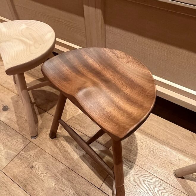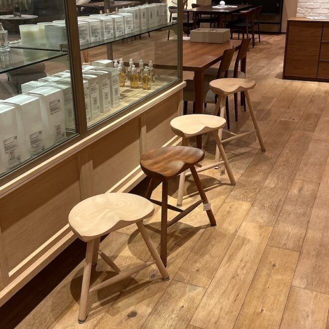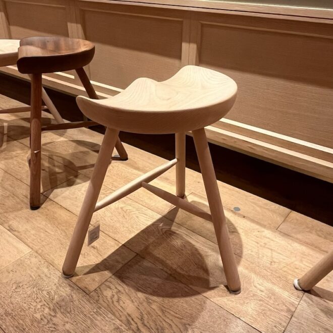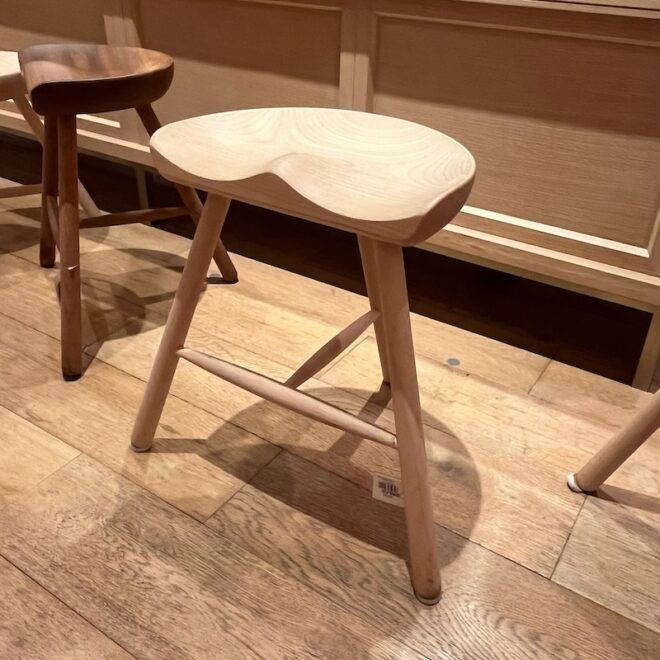 シューメーカースツールが長く愛されているのには、いくつかの理由があります。まず、座面がお尻の形に合わせて丁寧に削り出されているため、木製でありながら柔らかな座り心地を実現しています。また、仕上げには「ソープフィニッシュ」という技法が用いられており、石鹸の泡が木材をコーティングすることで、白木の風合いと自然な質感を楽しめます。さらに、使用されているビーチ材(日本のぶな)は、野球のバットにも使われるほど堅くて丈夫な素材。これにより、子どもから大人まで安心して使用できる耐久性を持っています。