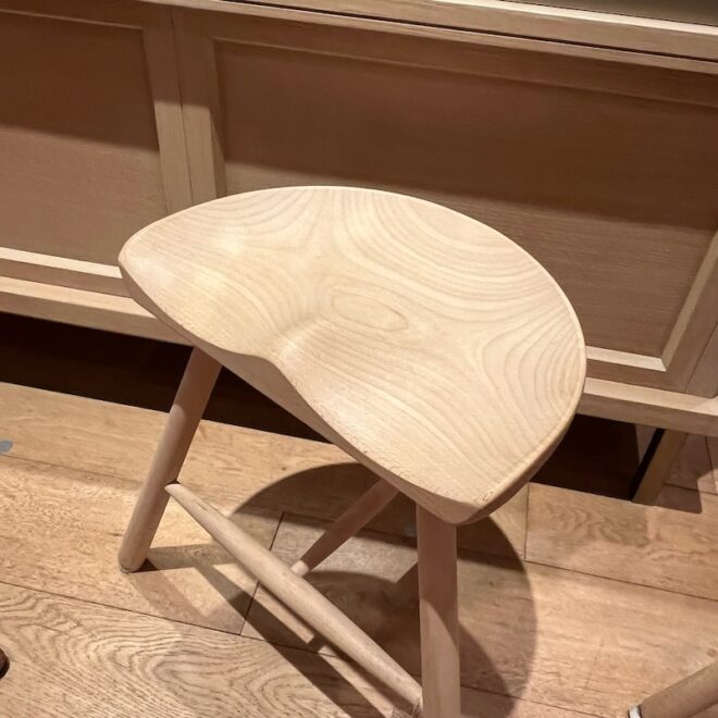 シューメーカースツールを一目見たとき、そのユニークな形に心惹かれる方も多いはず。座面はお尻の形に合わせてくぼんでおり、なめらかなビーチ材の木肌と3本の丸みを帯びた脚が特徴です。このデザインは、もともと靴職人が長時間座って作業するために生み出されたもので、座り心地の良さを追求しながら改良が重ねられてきました。一見するとシンプルな形ですが、その背後には機能性を重視した職人たちの知恵が詰まっています。