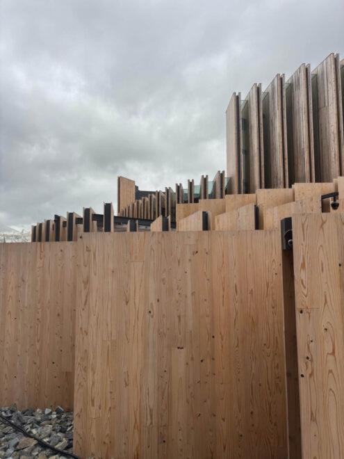 CLTとは、板を繊維方向が直交するように積層接着した厚みのあるパネルで、高い強度と耐久性を持ち、環境負荷の低減にも寄与します。建物の内外壁には、280組560枚のCLTパネルが使用されており、これらは会期終了後に解体され、全国各地で建物として再利用される予定です。そのため、加工を最小限に留めた四角い板のまま使用され、解体や再利用がしやすい設計となっています。