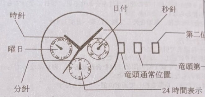 文字盤には、通常の時刻表示の他に、「曜日」、「日付」、「24時間表示」がついていますが、通常の肉眼では、