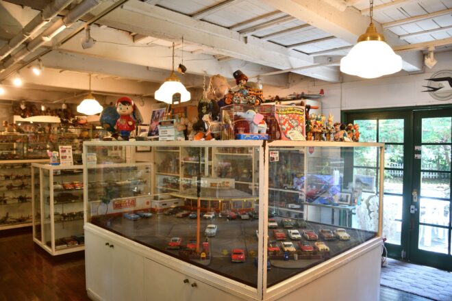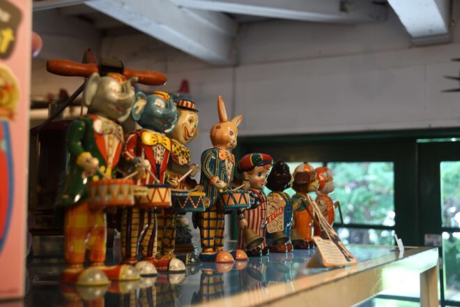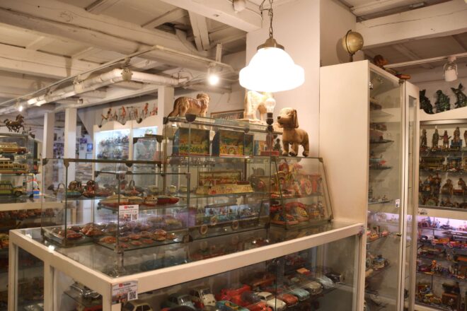 玄関を開けると、あたたかな木の内装とおもちゃの色彩が迎えてくれました。壁際に並ぶガラスケースの中で、古き良き時代のブリキのおもちゃたちが静かに輝いています。建物の隅々にまで、人の手で直し、大切に使い続けてきた痕跡が残っていました。この空間がもうすぐ閉じられると思うと、とても残念です。