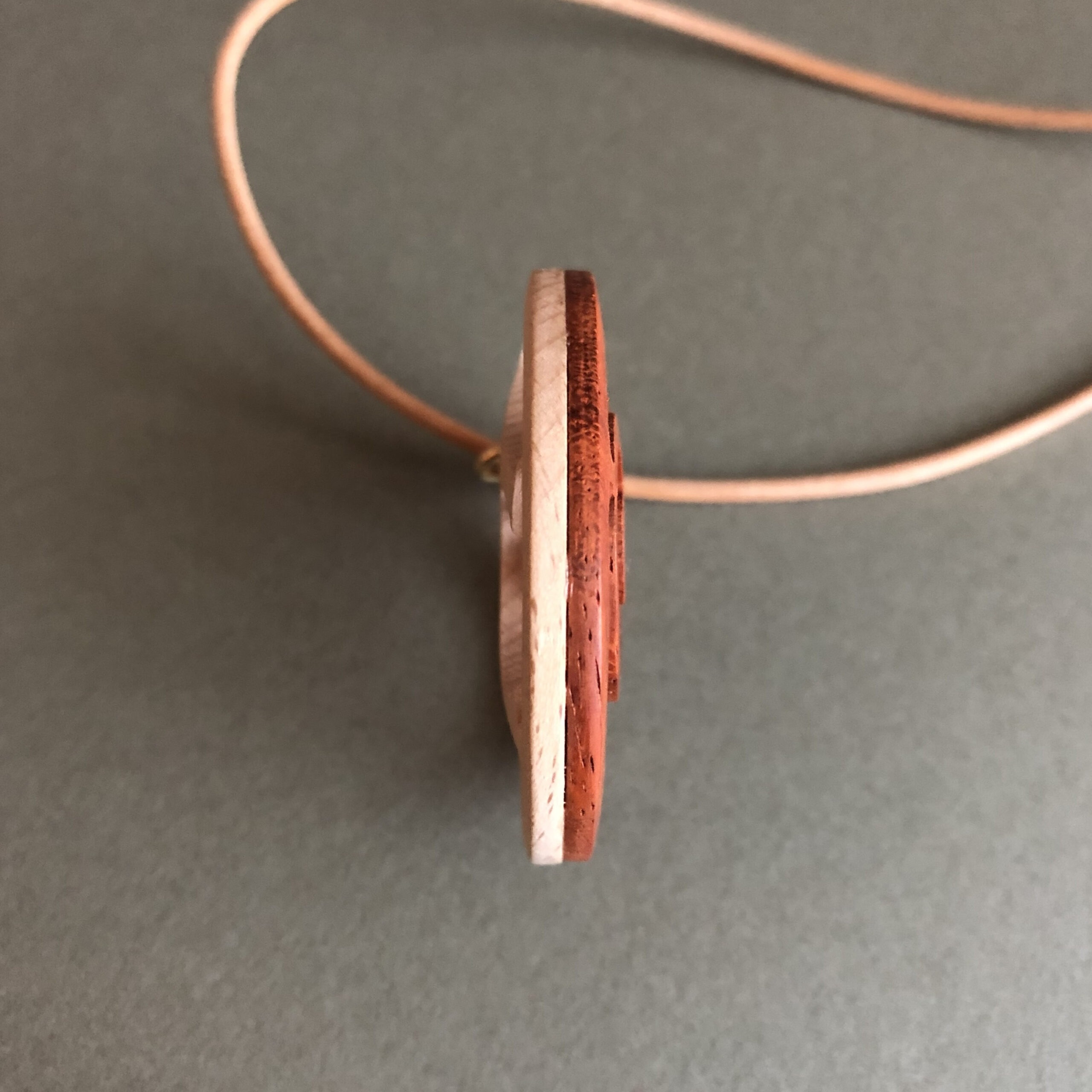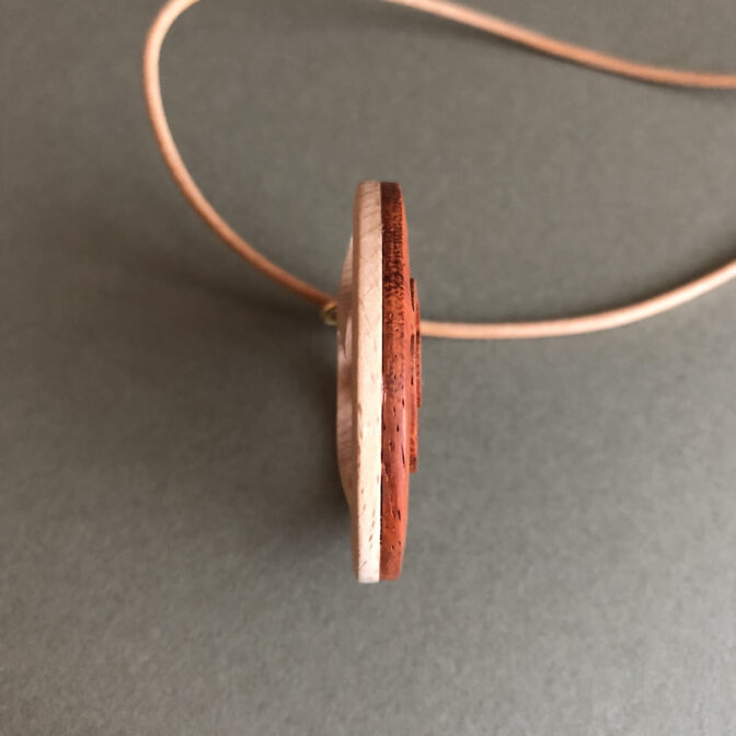 つけはずしについては、革ひもに取り付けた木の球を、反対側の輪に通して取り付けます。